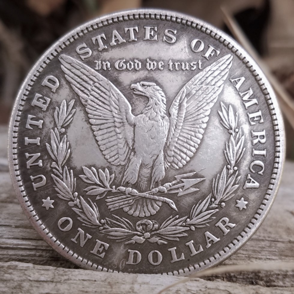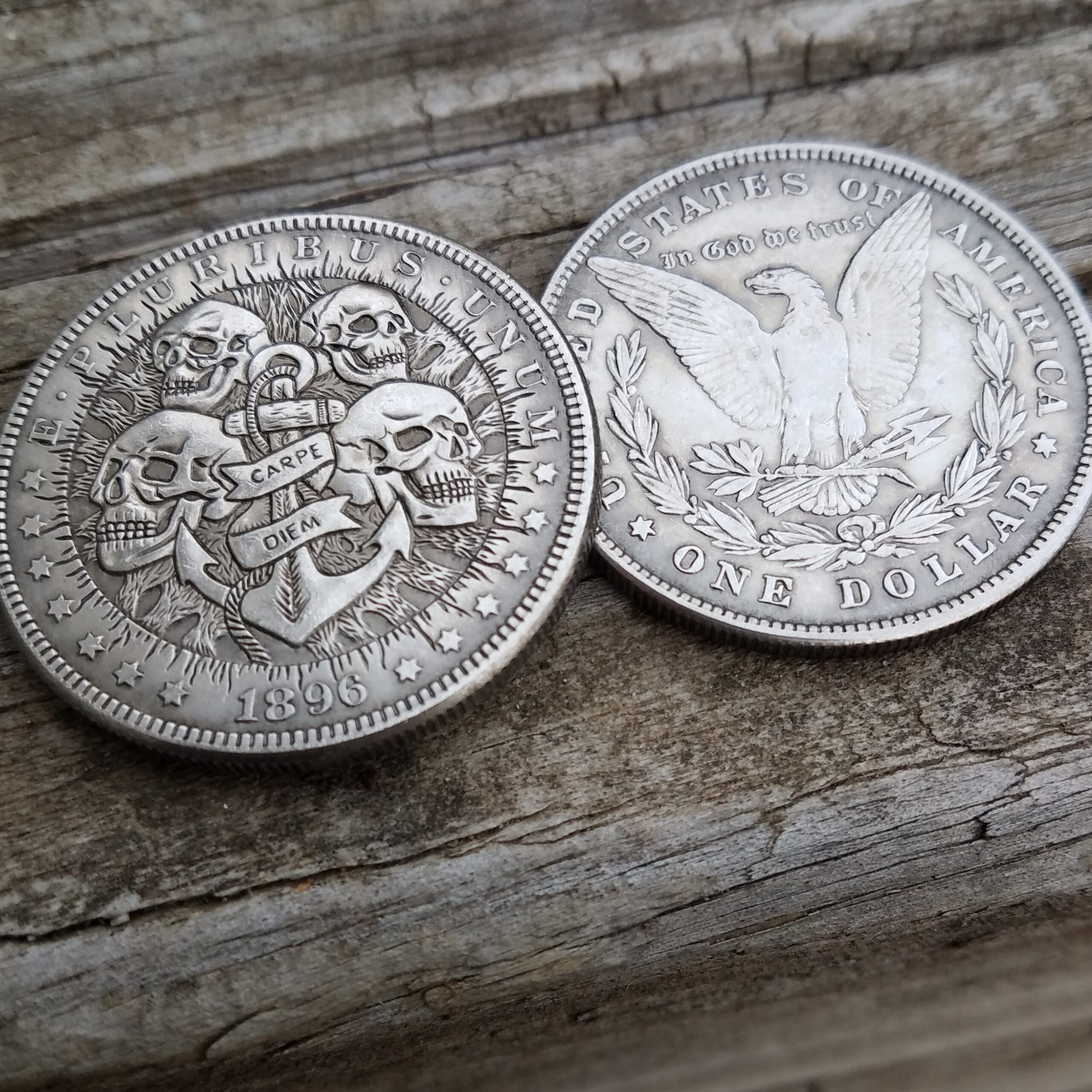 QUALITY COIN ART – The Coin is reproduction 1896 Morgan Silver Dollar Coin. It is 1.50″ Diameter and 3/32″ Thickness (About Two Quarters Thick) and Weighs .9 Ounces (27 Grams).The front side features an anchor with the saying “carpe diem” written on it and adds four skulls to complete the picture. On the rear is an American Eagle clutching an olive branch and three arrows. It celebrates a slice of Gothic-Americana with elements of the underworld in the design. It is a great example of fantasy coin art.