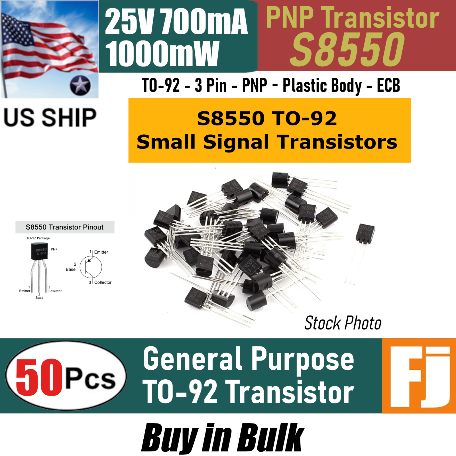 50pcs S8550 PNP Transistor TO-92 25V 700mA 625mW | US Ship