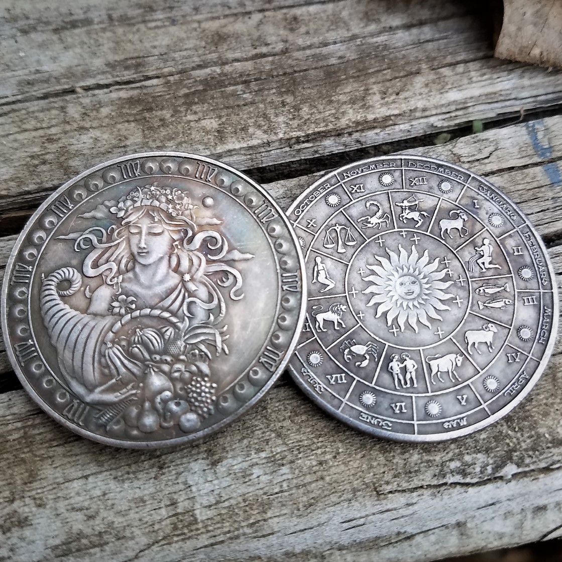 This coin depicts an image of Virgo. Virgo is the sixth astrological sign in the Zodiac. It spans the 150–180th degree of the zodiac. On the back is a mapping of all 12 signs of the zodiac. This Zinc-alloy medallion is great gift for anyone who is a Virgo born between August 23 and September 22. Virgo is shown as a harvest maiden, with a cornucopia in her hands. Virgo’s nature is earthbound, alert to creatures great and very small.